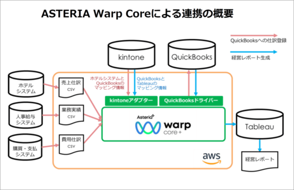 例えば、旅館やホテルといった宿泊施設の運営を行う株式会社星野リゾートでは、ASTERIA Warpを介して会計システム、ホテルシステム、BIツールの連携を実現している。この事例の注目点は、エンジニア抜きでこのシステムを構築したという事実だ。