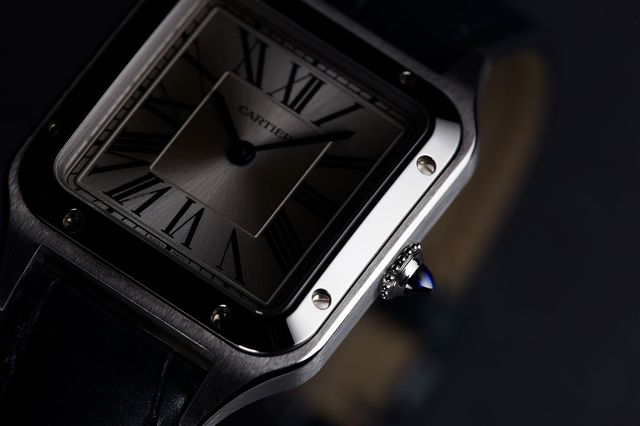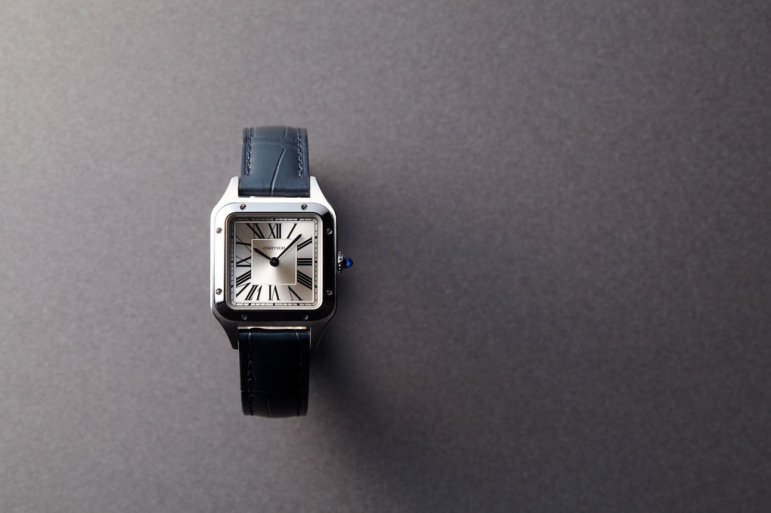 時計の顔である文字盤は一目で誰もがそれとわかる。リューズのブルーカボションと相まって、まさにThe Cartierである