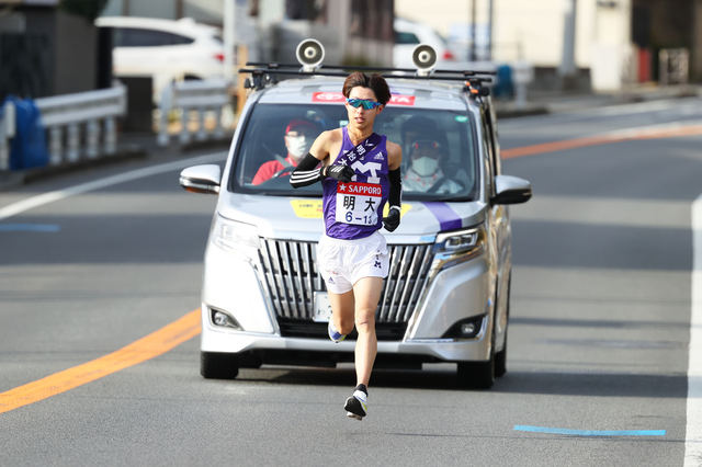 2021年1月3日、箱根駅伝、復路7区を走る手嶋杏丞(明大) 写真=アフロ