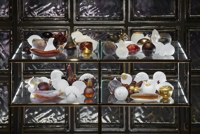 ひと組ずつ、簡単に紹介すると、クロエ・ケナムはグラフィック、言語、有機物、家具などを本来の文脈から抜き出し、図式化して用いることで抽象化してしまう、というスタイルだそうだ。エルメスのクリスタル工房で制作した、クリスタルで作られた果実がガラスの棚に載せられた『La grande place』という作品をメインに、いくつかの作品が、メンターであるイザベル・コルナロの作品とともに展示されている。