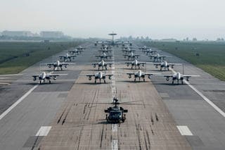 1月5日、カザフスタン最大の都市アルマトイで抗議するデモ隊を静止するため道路を封鎖した機動隊。銃口はデモ隊のほうに向けられている(写真:AP/アフロ)