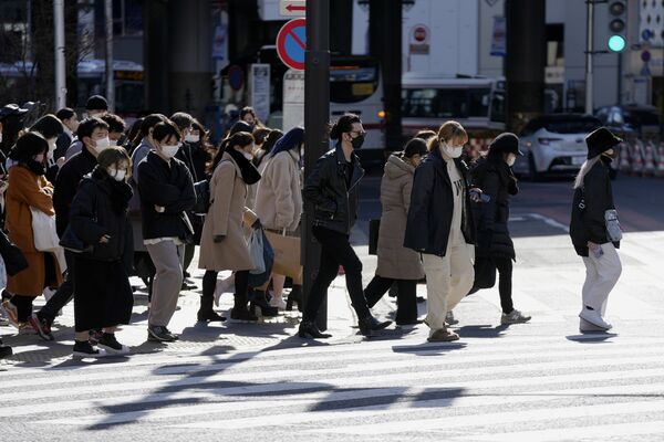 マスクをつけて横断歩道を歩く人々(2022年1月21日、東京都で撮影、写真:AP/アフロ)