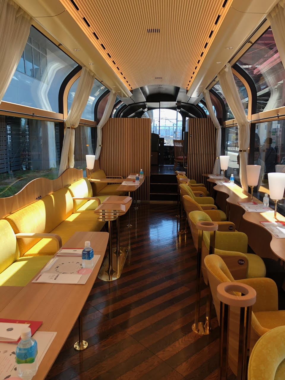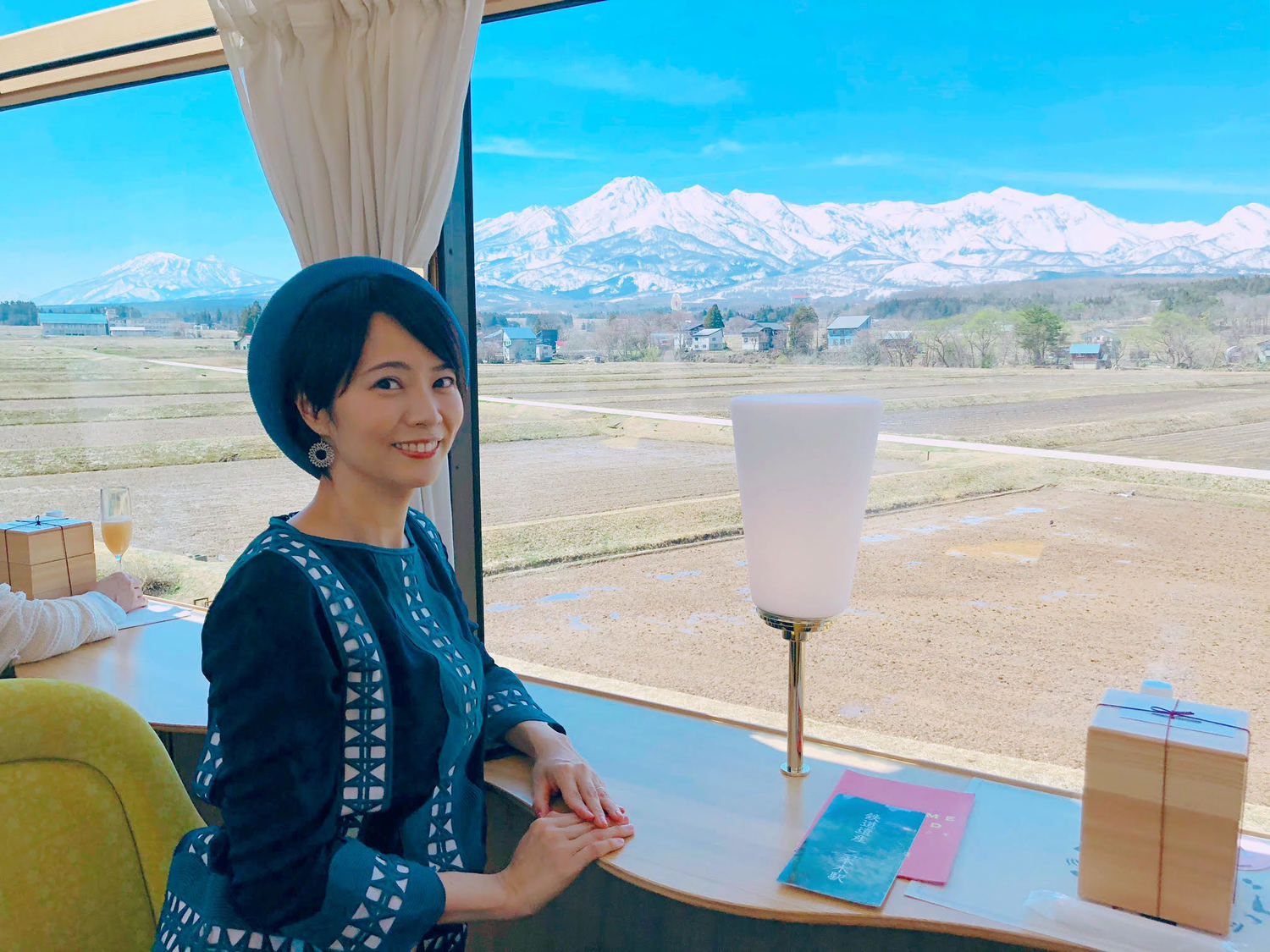 また、内装のデザインも素敵で、私が乗った1号車は日本海側と妙高山側を向くラウンジ形式。木目の美しい越後杉が使用され、シートは黄金色で、それらの内装が外の自然景観とも調和してとても心地の良い空間です。「雪月花」には「all made in NIIGATA」というテーマがあって、調度品などもすべて新潟の工場で生まれたオール新潟県産。景色も車内も新潟の魅力を存分に味わえます。