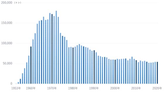 そこで、魚肉ソーセージの生産量を調べてみた。日本缶詰びん詰レトルト食品協会のデータによれば、生産量のピークは1970年代で、1972年に18万トンを超えていた。その後減少したものの、ここ20年ぐらいの生産量は5~6万トンと横ばいで安定している。