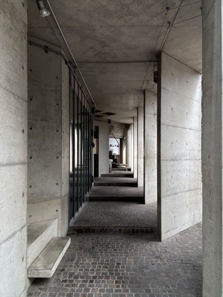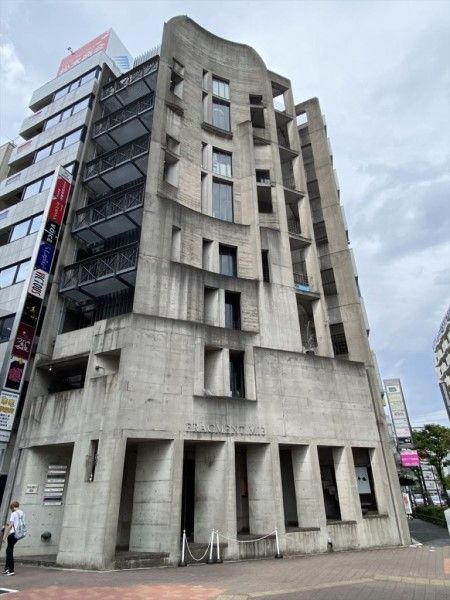 エッジがキンキンにとがったコンクリート打ち放し。限られた敷地の中で1階に設けた柱廊(コロネード)。そしてなんといっても立面(りつめん)が印象的。北・東の前面道路ではなく「交差点」に正対する形で立面がデザインされている(建築の記事では「ファサード」と書くべきところだと思うが、個人的にファサードという内輪っぽい言葉が嫌いなので「立面」でいく)。年月を経たことによる打ち放しの黒ずみもあって、その立面は古代ローマの遺跡を見るような、ただならぬオーラを漂わせる。