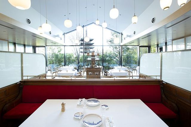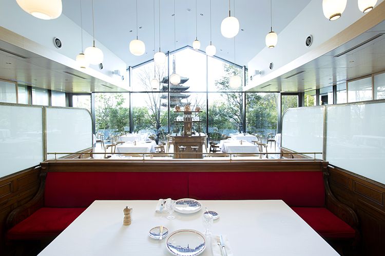 さて、「ブノワ」はフランス料理好きの間では有名なビストロで、本店は1912年にパリで創業した老舗だ。2005年からはフランスのカリスマシェフ、アラン・デュカスが設立した「デュカス・パリ」が経営を受け継いでおり、現在はニューヨーク、青山と京都にも店舗がある。アラン・デュカスが選んだアンティークの調度品や赤いシートの椅子など、京都店の内装には他の「ブノワ」の店舗と共通する要素も少なくないが、窓から法観寺・"八坂の塔"を眺めることができるのはここならでは。