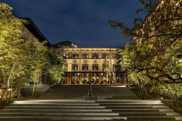 「ザ・ホテル青龍 京都清水」の夜の外観。「ブノワ 京都」は階段下の外廊下の反対側に位置する、もとは小学校のグラウンドだった場所にある