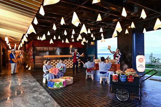 フロント階の扉が開くと、和紙の提灯が照らす「湯の広場」と別府湾の絶景が広がる。ずらりと並ぶ「手湯」の桶には源泉が滔々と流れ落ち、温泉情緒を盛り上げる。併設する足湯からは、水平線や朝日が眺められ、くつろぎスポットになっている。