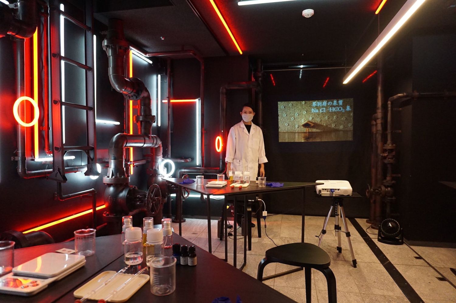 昼のラボは、源泉を使った温泉ミスト作りを実施。スタッフが泉質や入浴法などを紹介する「温泉いろは」も楽しい