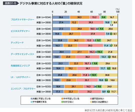 一方、独立行政法人情報処理推進機構が発行する『DX白書2021』によれば「事業・業務に精通したデータ解析・分析ができる人材」である「データサイエンティスト」が「大幅に不足している」「やや不足している」と回答した国内企業は55%を超えている。