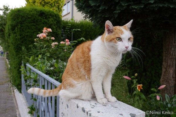 早朝、ホテルから散策をはじめると、すぐ近くにある家の塀に猫が乗っていました。「猫ちゃん、朝早くからおつかれさま」と声をかけ、散策を続けます。