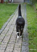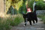 大きな黒い猫が家の門柱の間から顔を覗かせていました。耳やシッポ、胴の長さからすると、どうもメインクーンのようです。「あなたはメインクーンですか?」と話しかけると、メインクーンという単語が聞き慣れているとみえて、「そだよ」と、耳をくるりと回しました。