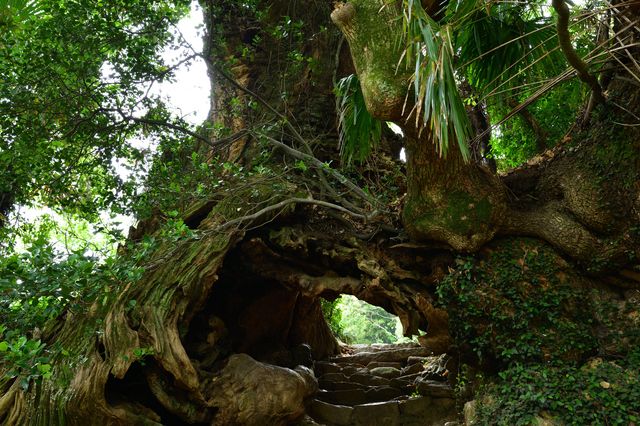 お参りを終えたら、境外にも、ぜひ立ち寄ってほしい場所がある。境内最奥の門から出て徒歩数分のところにある「生樹の御門」だ。樹齢約3000年と言われる根回り約30mの巨大な楠で、幹の根元に開いた自然の空洞を門に見立て、それをくぐって奥の院へ参拝していたことから「生樹の御門」と呼ばれるようになった。