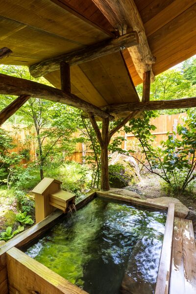 丸太の梁が目を引く木造りの内湯の外には、野趣溢れる岩造りの露天風呂がある。また無料の貸し切り風呂「山野草の湯」が3つあり、すべてに露天風呂が付く。