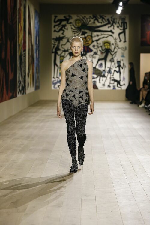 ファーストルックは全面ビーズ刺しゅうのボディスーツとタイツの組み合わせ。健康的なボディを強調したアイテムは、プレタポルテでもたくさん登場した旬のアイテムです。アイコンのバージャケットコートにもティアドロップ(涙型)のビーズ刺しゅうしたタイツを合わせ、一味違うエレガンスを打ち出しています。