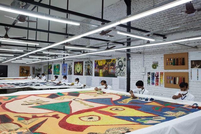 会場を彩った壁一面の装飾は、インド人アーティストのマドヴィ・パレクとメヌ・パレクのアートを、チャーナキヤ工芸学校の職人たちの立体刺しゅうでカラフルに仕上げたものです。このアート作品は男性/女性の概念を、対立ではなく補完し合う存在としてアピールしているのです。
