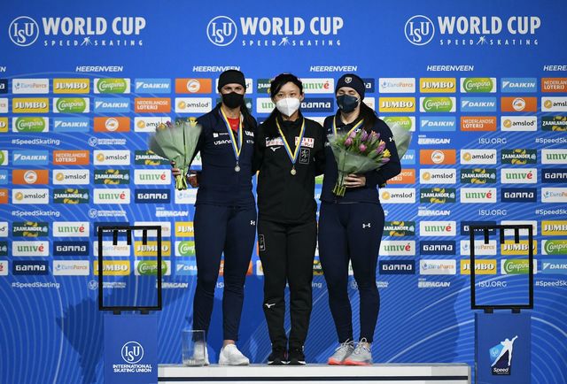 2022年3月13日、スピードスケートW杯最終戦、女子1000m表彰式 写真=ロイター/アフロ