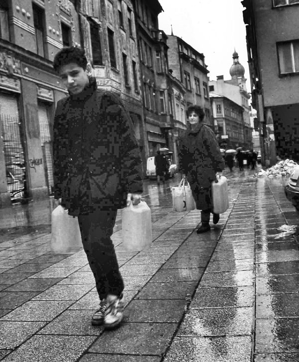 小さな公園にある湧水にはポリタンクを持った人々が水を汲みに集まっていた。順番を待つ間、どの顔も不安そうに空や辺りの建物を見上げている。人が集まる場所は狙われるからだ。順番を待つ列の中に一人の少年がいた。ミハイロというその少年の家は1キロ程離れたところだという。ポリタンク2つは水を入れるとかなりの重さだ。
