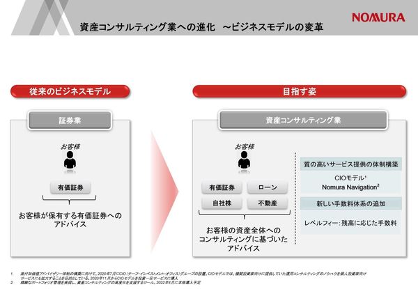 具体例として、売買ごとではなくお預かり資産の金額に応じて一定の手数料をいただく新たな手数料体系(レベルフィー)を今春本格的に導入する予定です。中長期の目線で質の高いコンサルティングを行いお客様のご資産が拡大することで、お客様にご満足いただき、さらにビジネスの機会をいただく。お客様と当社が同じベクトルを向くようになることで、これまで以上に野村への信頼が高まるものと考えています。