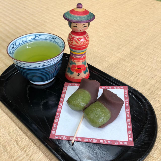 三嶋大社の名物「福太郎餅」こけしと一緒にパチリ