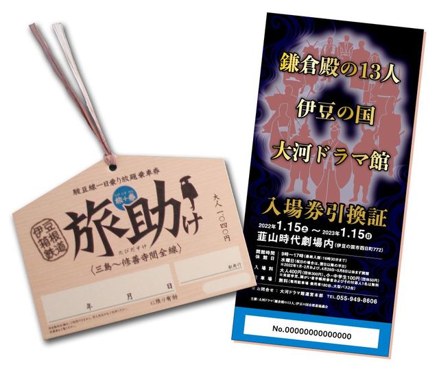 旅助け・大河ドラマ館セット券(駿豆線1日フリー乗車券「旅助け」と大河ドラマ館入場券引換証のセット)は大人1340円。大河ドラマ館セット乗車券(三島駅~韮山駅間往復乗車券+大河ドラマ館入館引換券のセット乗車券)も大人800円で発売中 写真=伊豆箱根鉄道