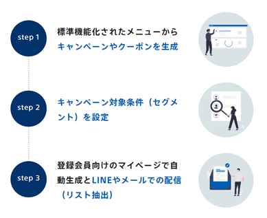 クラウドで提供するため、サーバーを構築する必要もありません。また、申込後最短一日で会員データベースを保有することが可能です。会員向けのキャンペーンやクーポンを入力フォームから簡単に設定でき、地域や年齢、性別など会員の特性に応じた販売促進施策をすぐに実行することもできます。