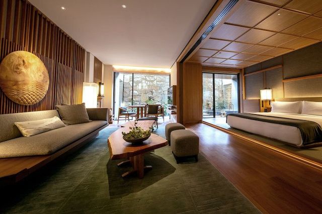 Onsenスイート(101-111㎡)。窓の向こうに露天風呂。