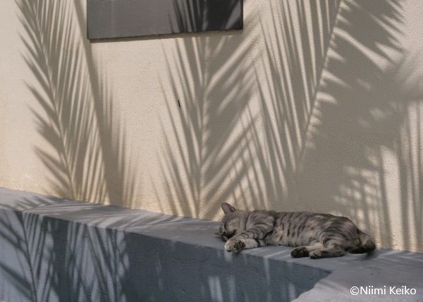 椰子の葉影ですやすやと寝ている猫。起こさないように、そっとシャッターを押したのですが、気づかれてしまいました。