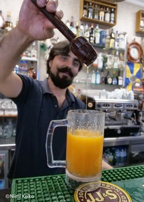「ポンチャ発祥の地は、ここカッマラ・デ・ローボスです。マデイラ島のサトウキビから作られたラム酒が主体です。当初は、ラム酒とキビ糖、レモンジュースで作られていましたが、いまでは、オレンジやパッションフルーツのジュース、蜂蜜などを好みに合わせてアレンジしています」