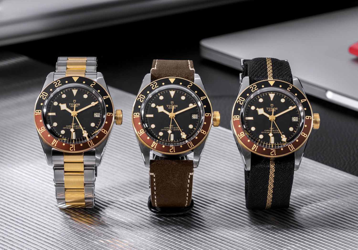 『ブラックベイ GMT S&G』ブレスレット、レザーストラップ、ファブリックストラップの3種類がラインナップされた。自動巻き(Cal.MT5652)、ステンレススティールケース、41㎜径、63万4700円(ブレスレット)