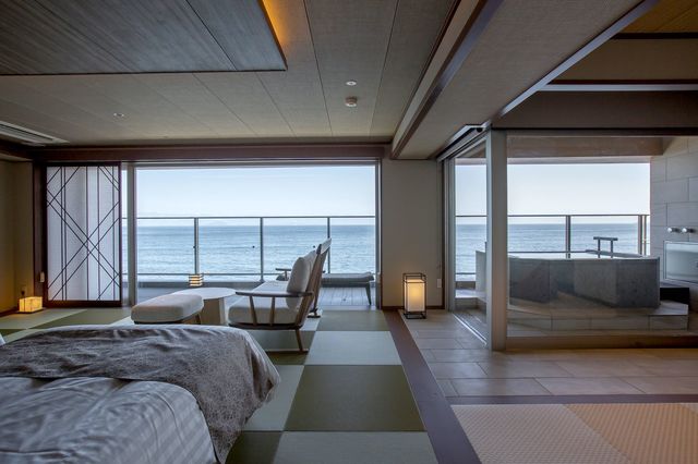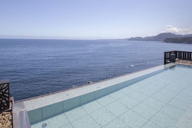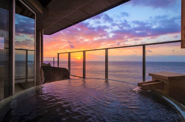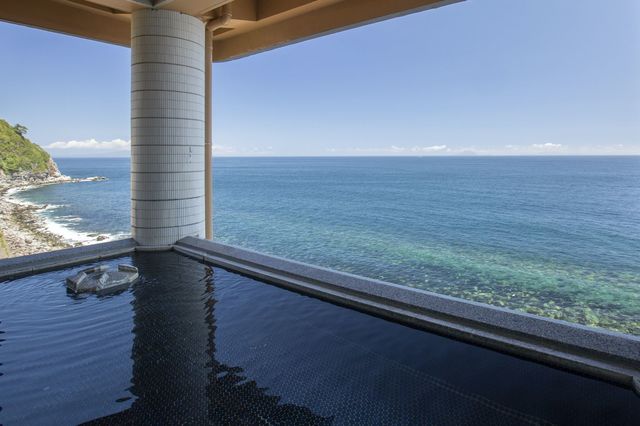 最近は露天風呂付き客室が次々と誕生している。潮騒倶楽部と名付けられたエグゼクティブ客室には、温泉掛け流しの露天風呂付きスイートや半露天風呂付きスイート、絶景和モダンなど、さまざまなタイプの客室を用意する。チェックアウトは12時。滞在中は絶景温泉をずっと貸し切りにできる贅沢。2022年には露天風呂付きコーナーツイン・碧(あおい)などがリニューアルオープン。