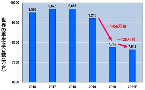 2020年に世界中で感染が拡大したコロナにより、クルマの生産台数が低迷している(図1)。コロナ前の2019年に9218万台だった世界のクルマ生産台数は、2020年に1456万台少ない7762万台になり、2021年はさらに120万台少ない7642万台になった模様である。