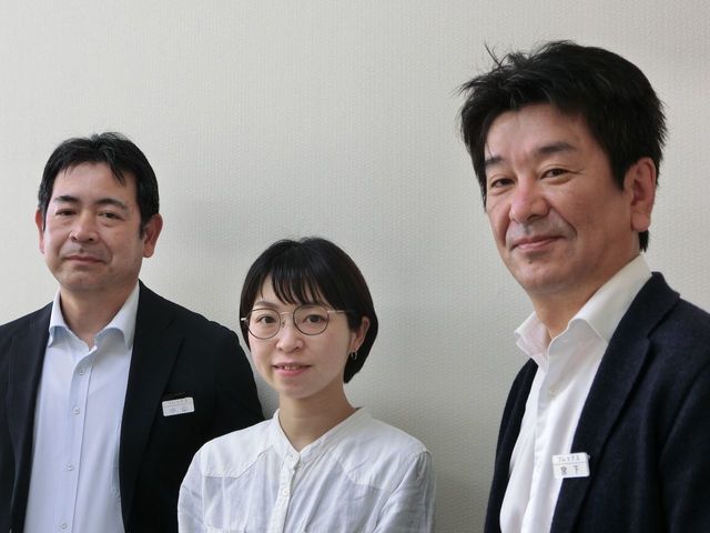 取材にご協力いただいたフレックスジャパン株式会社のみなさん。写真右から常務取締役の宮下靖さん、生産統括本部 生産事業部 本社工場開発チームの堀内恵理香さん、生産統括本部と本社工場の責任者の小山幹人さん
