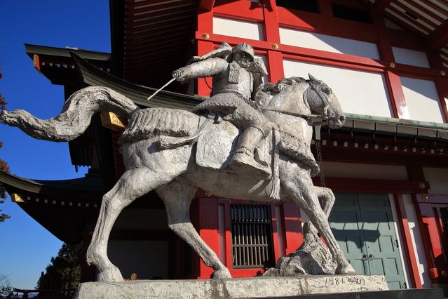 武蔵御嶽神社にある畠山重忠の像。神社には重忠奉納の国宝「赤絲威鎧 兜・大袖付」(あかいとおどしよろい)が納められている。