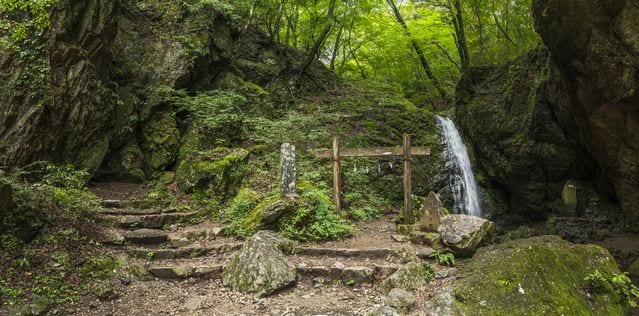 宿坊に泊まれば、こちらならではの体験もできる。そのひとつは滝行だ。宿坊から山道を歩いて近くの沢に行き、祝詞を唱えながら流れ落ちる滝を浴びて心身を清める。