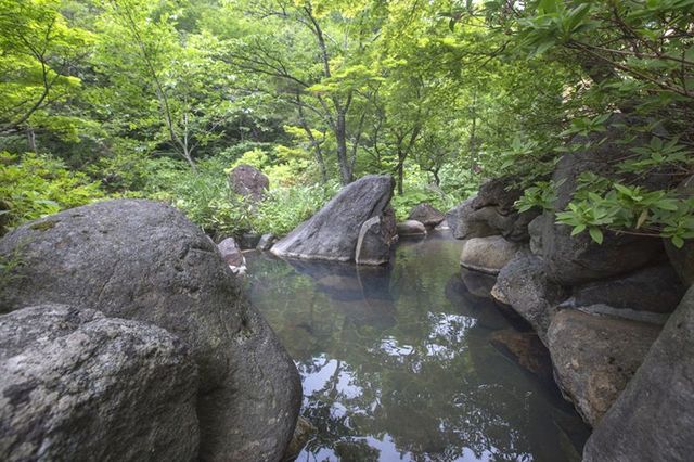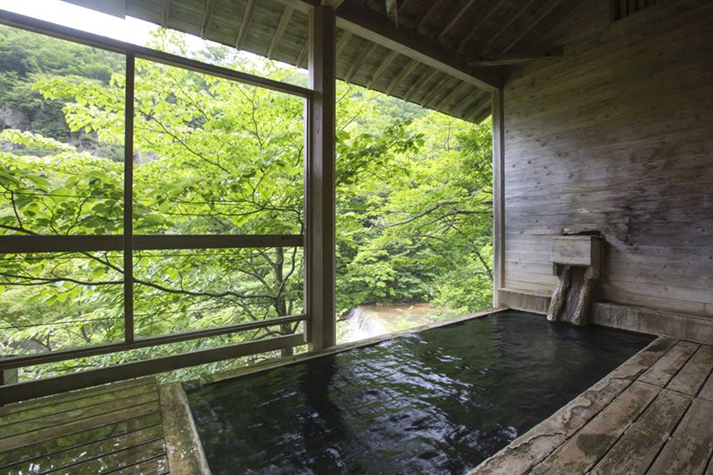 大浴場に併設して露天風呂もあり、こちらは渓谷の爽やかな風と森の緑の色彩が心地よい。名湯に浸かりながら、心静かにリフレッシュできる最高のひと時。穏やかな時間が流れている。夜の星もきれいだ。