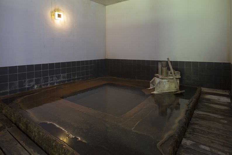 男女別の大浴場には、「ぬる湯(42〜43度)」と「あつ湯(47度)」の浴槽がそれぞれにある。あつ湯の入浴スタイルに、伝統の「かけ湯」がある。それは湯船の縁に寝そべり、竹の筒で温泉をくみながら胃や腸のあたりにゆっくりと100杯ほどかけるというものだ。自然発生的に生まれた湯浴みスタイルでだそうで、なるほど、じんわりと体にしみわたり、芯から温まる。