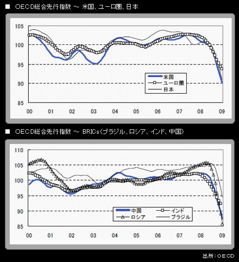 世界経済が「崖から落ちた」ことをあらためて確認させてくれたのが、6日に発表された、OECD総合先行指数(CLI)の1月分である。米国が90.1(前月比▲1.4ポイント)、ユーロ圏が93.7(同▲0.6ポイント)、日本が91.0(同▲1.5ポイント)と、いずれも急低下を継続。BRICsについても、ブラジルが94.5(前月比▲2.7ポイント)、ロシアが85.9(同▲3.3ポイント)、インドが92.4(同▲1.0ポイント)、中国が87.4(同▲2.1ポイント)と、いずれも大幅な低下となった。
