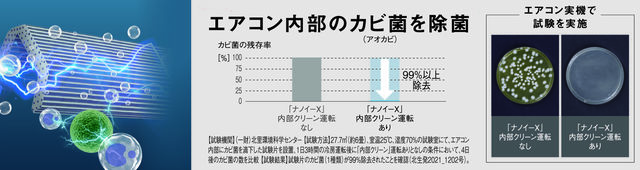 新「ナノイーX」内部クリーン運転によって、99%以上のカビ菌除去を確認。