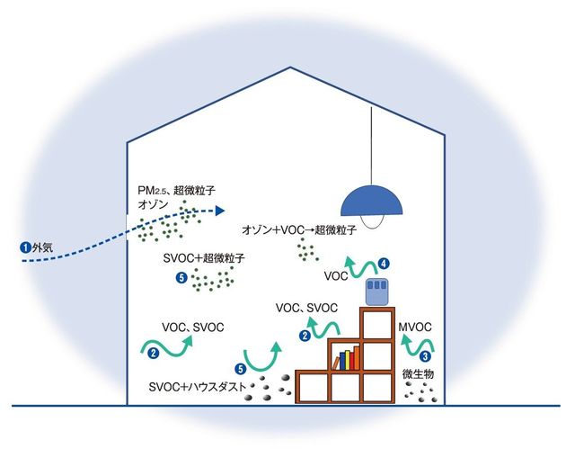 室内で発生するさまざまな環境汚染物質①外気にも汚染物質(PM2.5、超微粒子、オゾンなど)が存在 ②建物内装材料や家具、家庭用品などから、VOC(揮発性有機化合物)およびSVOC(準揮発性有機化合物)が発生 ③微生物から、MVOC(微生物由来の揮発性有機化合物)が発生 ④VOCによっては、オゾンと反応し超微粒子を空気中で新たに生成する ⑤SVOCは揮発性が低いものの、ハウスダストや浮遊粒子に吸着するなど物質同士の相互作用がある その他、建物の性能や温湿度、居住者の行動など、室内空気質に影響を与える要因は多岐にわたる。