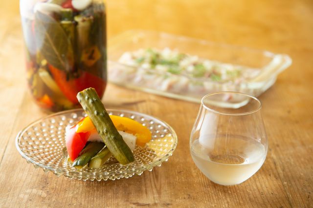「望 bo:純米吟醸 ひとごこち」の小野さんのおすすめ温度は8度。フレッシュな夏野菜のピクルスは最強のペアリング。暑い日の夕暮れにぴったり。