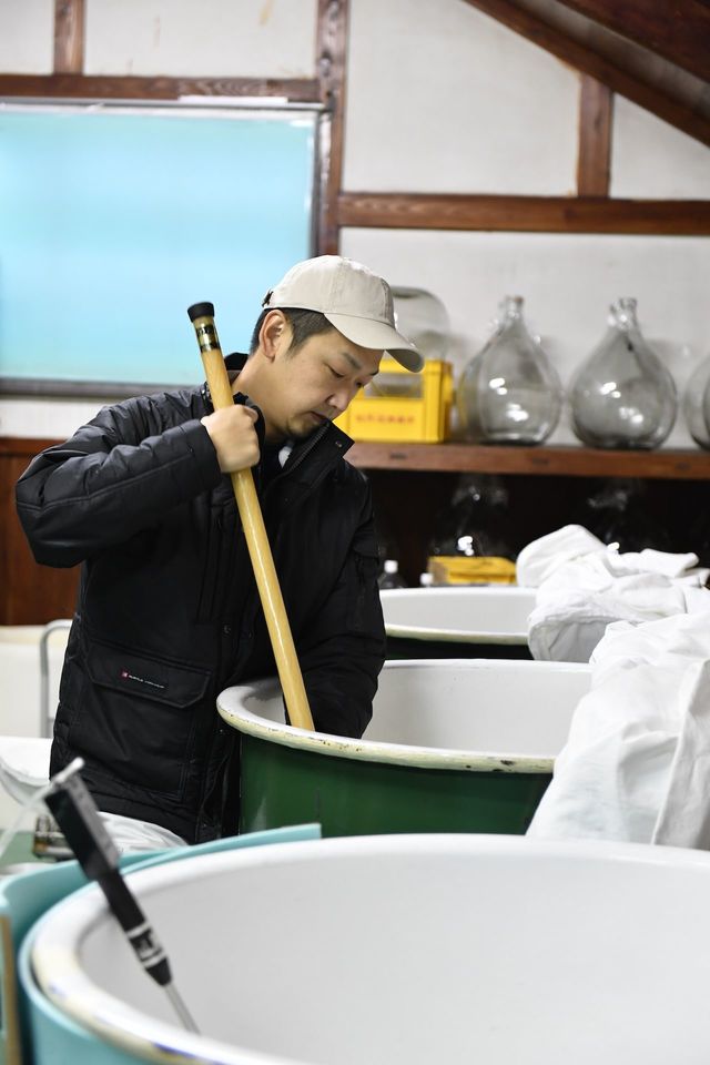 もろみを櫂棒(かいぼう)でまんべんなく混ぜ、発酵に最適な温度に保つ"櫂(かい)入れ"もフリースタイル。回数だけではなく、V字に混ぜる、X字に混ぜるなど、混ぜ方ももろみの状態に応じて変えている。