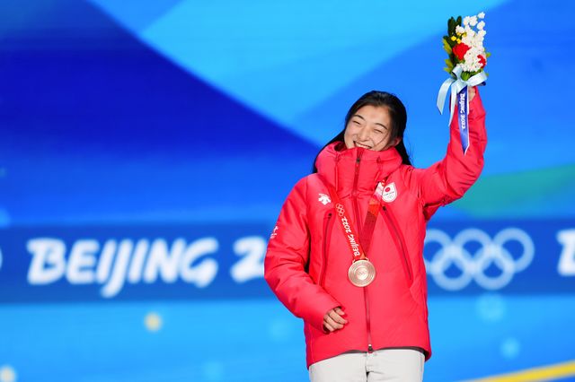 2022年2月18日、北京五輪、フィギュアスケート女子シングル表彰式での坂本花織 写真=新華社/アフロ