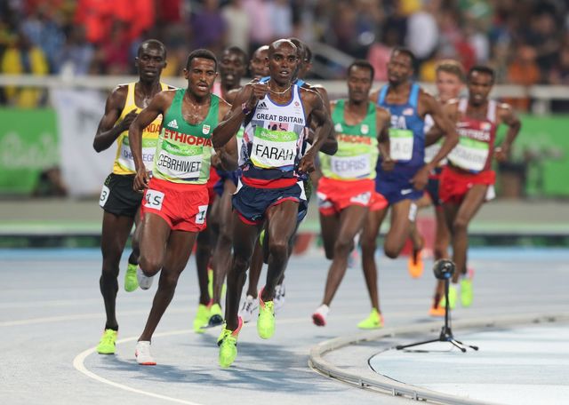 2016年リオデジャネイロオリンピック、男子5000mで先頭を走るモハメド・ファラー。この種目と10000mで金メダルを獲得。写真=Press Association/アフロ