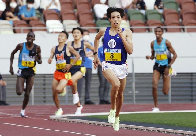 2022年5月22日、関東インカレ男子5000m決勝、13分42秒35で優勝した三浦龍司 写真=共同通信社
