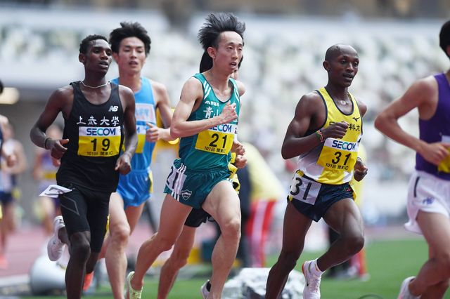 2022年5月19日、関東インカレ男子2部10000で日本人トップになった青学大の岸本大紀(写真中央) 写真=千葉 格/アフロ