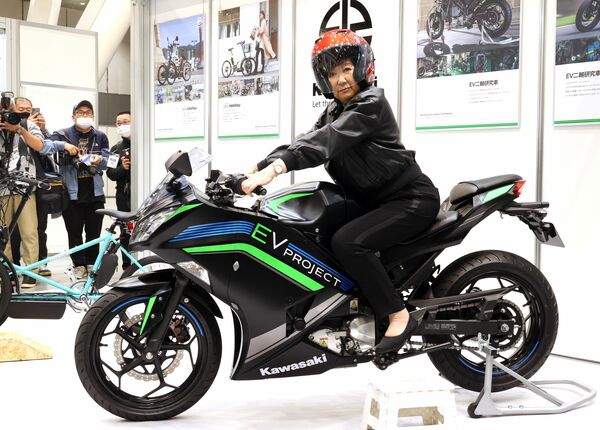 東京都主催が主催した電動バイクだけのイベント「EVバイクコレクション in TOKYO 2021」で電動バイクにまたがる小池百合子知事(写真:つのだよしお/アフロ)
