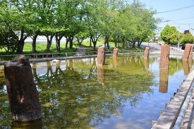 相模川橋脚。関東大震災の液状化現象にともなって地中から姿を現した中世の遺構で、保存処置がなされて史跡となっている