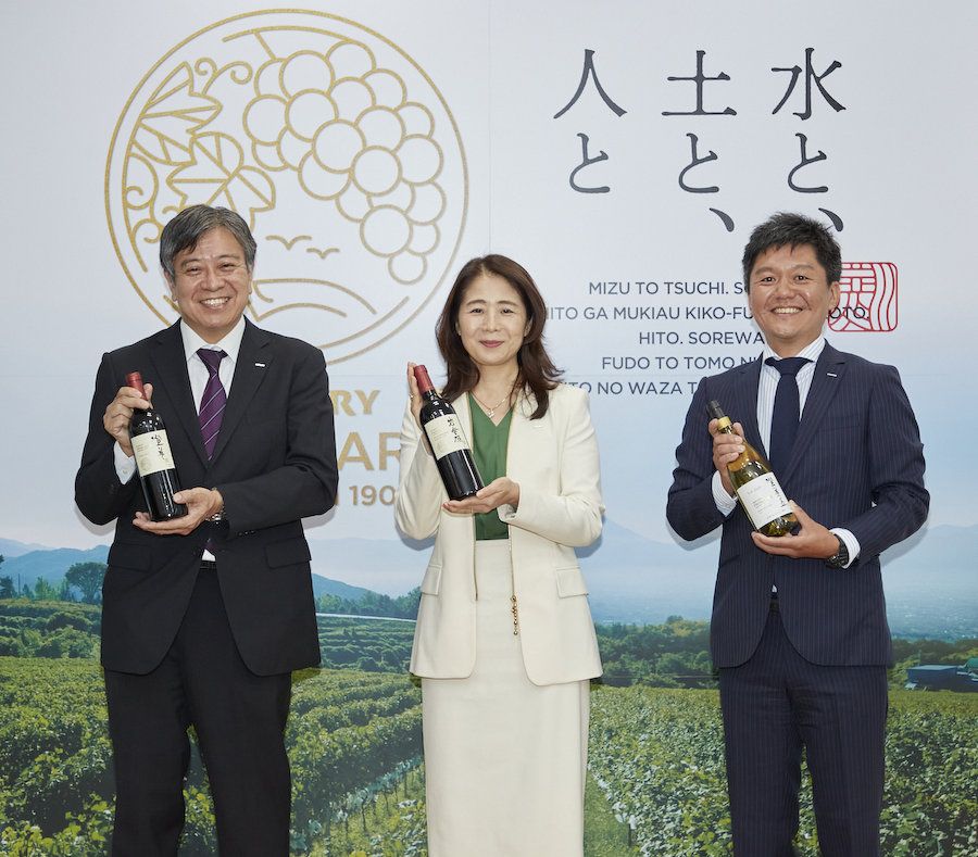 登壇者は左から、サントリーワインインターナショナル(株)サントリー登美の丘ワイナリー 所長 庄内 文雄氏、サントリーワインインターナショナル(株)代表取締役社長 吉雄 敬子氏、サントリーワインインターナショナル(株)サントリー登美の丘ワイナリー 栽培技師長 大山 弘平氏