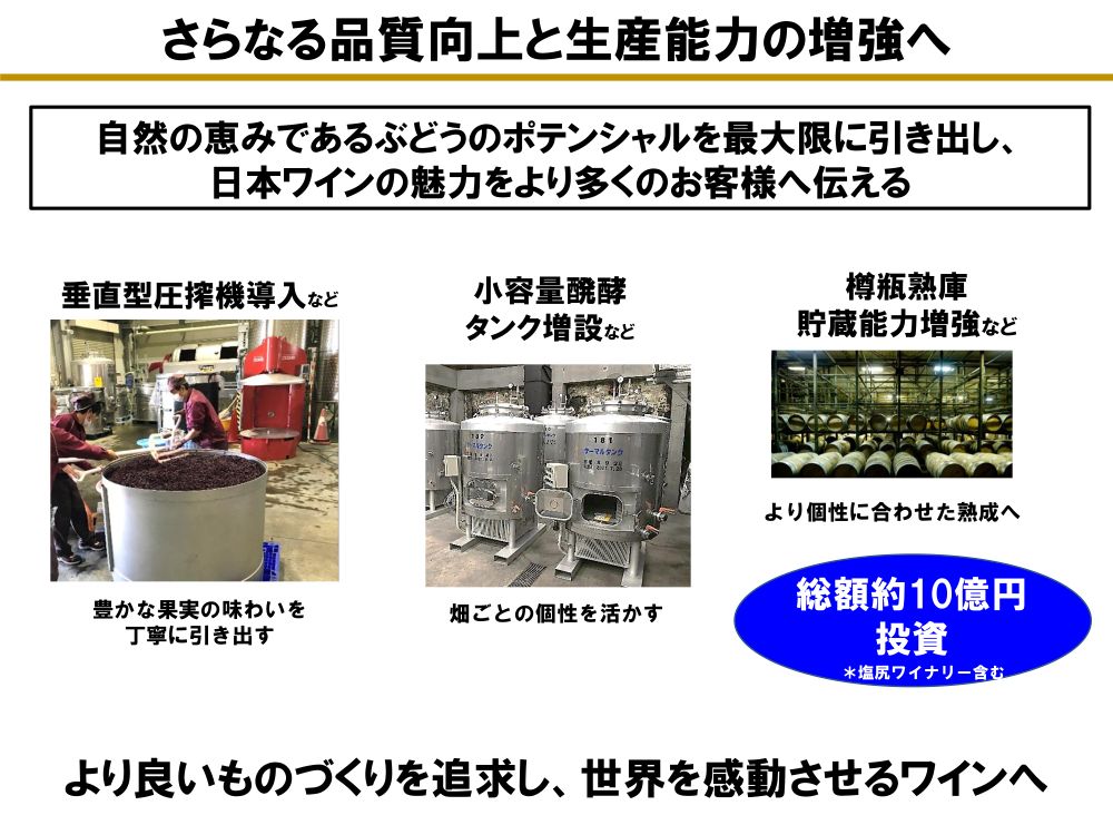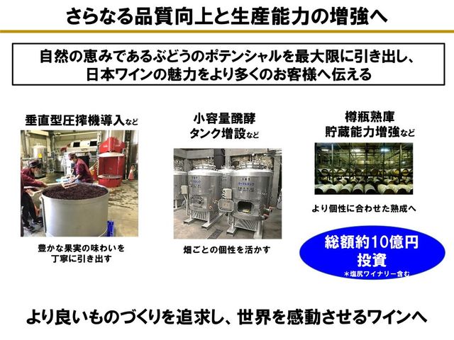 注目すべきは、この5億円とは別に、塩尻ワイナリーもふくめ、約10億円がワイナリーの設備へと投資されることだ。これらは、圧搾機、タンク、熟成庫へと向けられた投資であることから、より高精度で多様な醸造と熟成が期待される。